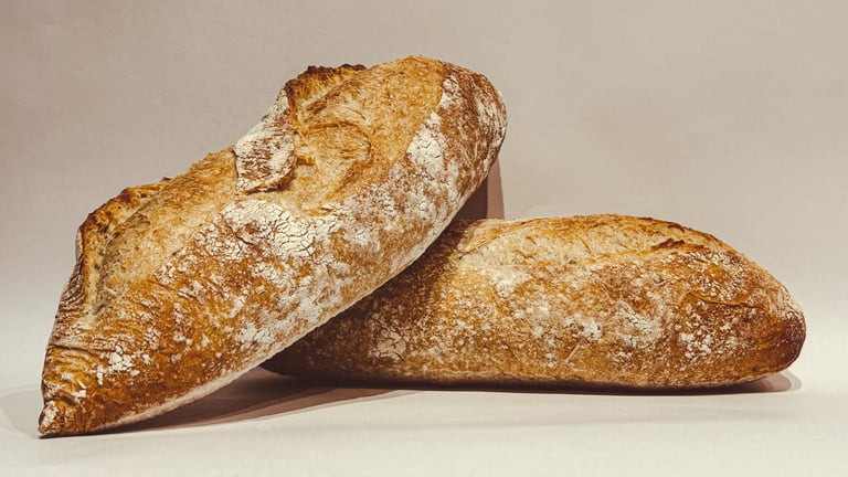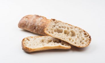 Típico pão branco italiano, massa de alta hidratação e fermentação longa, levain. Massa fina e crocante, com miolo bem alveolado.